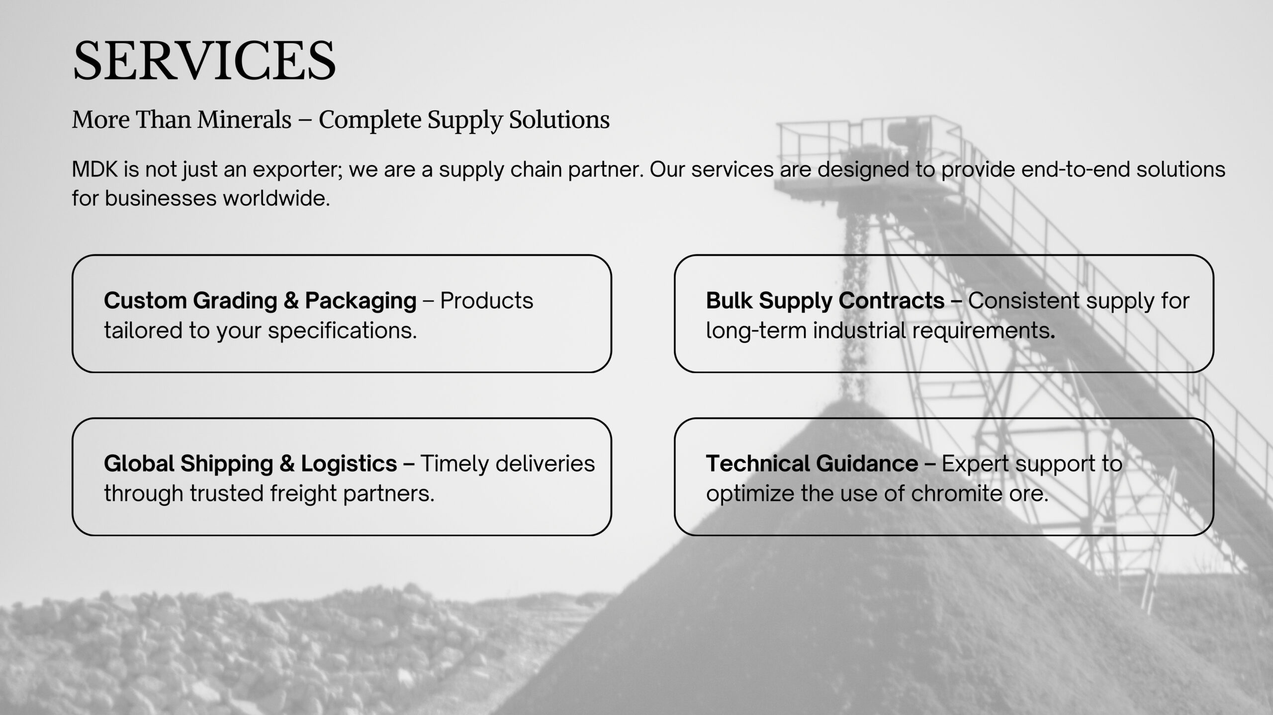 At MDK Enterprises, we go beyond mineral trading. With 9 years of proven expertise, we provide a comprehensive range of services that ensure our global clients receive premium-quality chromite ore and concentrates, delivered on time and exactly as required.
